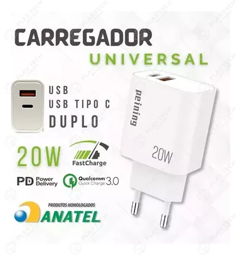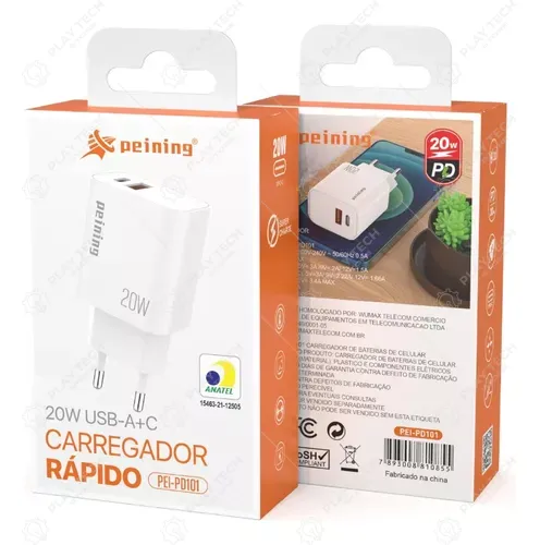 Carregue seu iPhone rapidamente com o Carregador Rápido USB-C 20W PEINING ! Compatível com todos os modelos de iPhone, este carregador oferece carregamento rápido, seguro e eficiente. Inclui cabo USB-C para Lightning, proteção inteligente e design compacto. Certificado pela Anatel e com eficiência energética A+B.