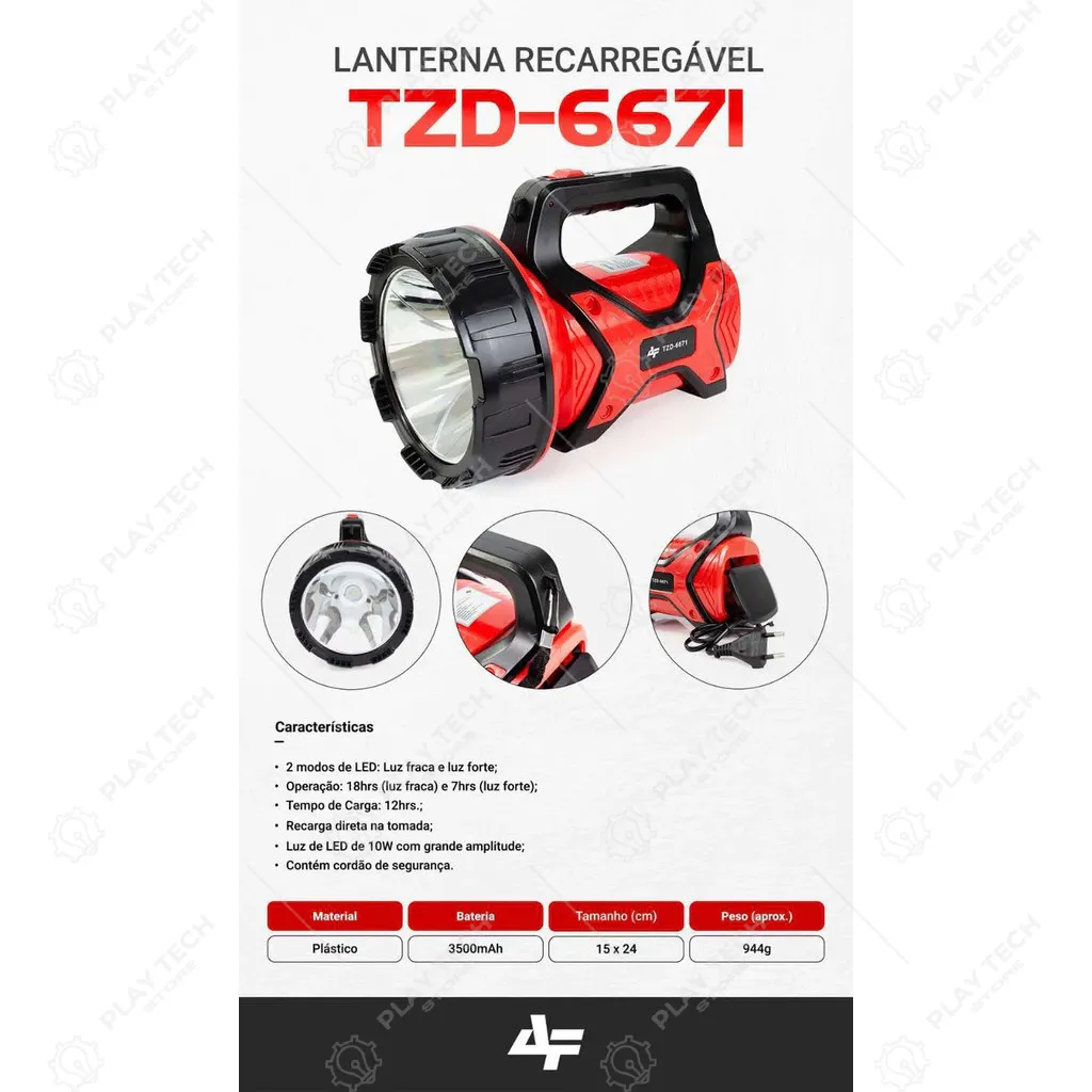 Ilumine seus caminhos com esta lanterna recarregável de alta potência! 🌟 Equipada com LED de 10W e alcance de 80 metros , oferece até 6 horas de autonomia . Resistente a respingos d’água, é perfeita para camping, segurança e emergências. ✨
