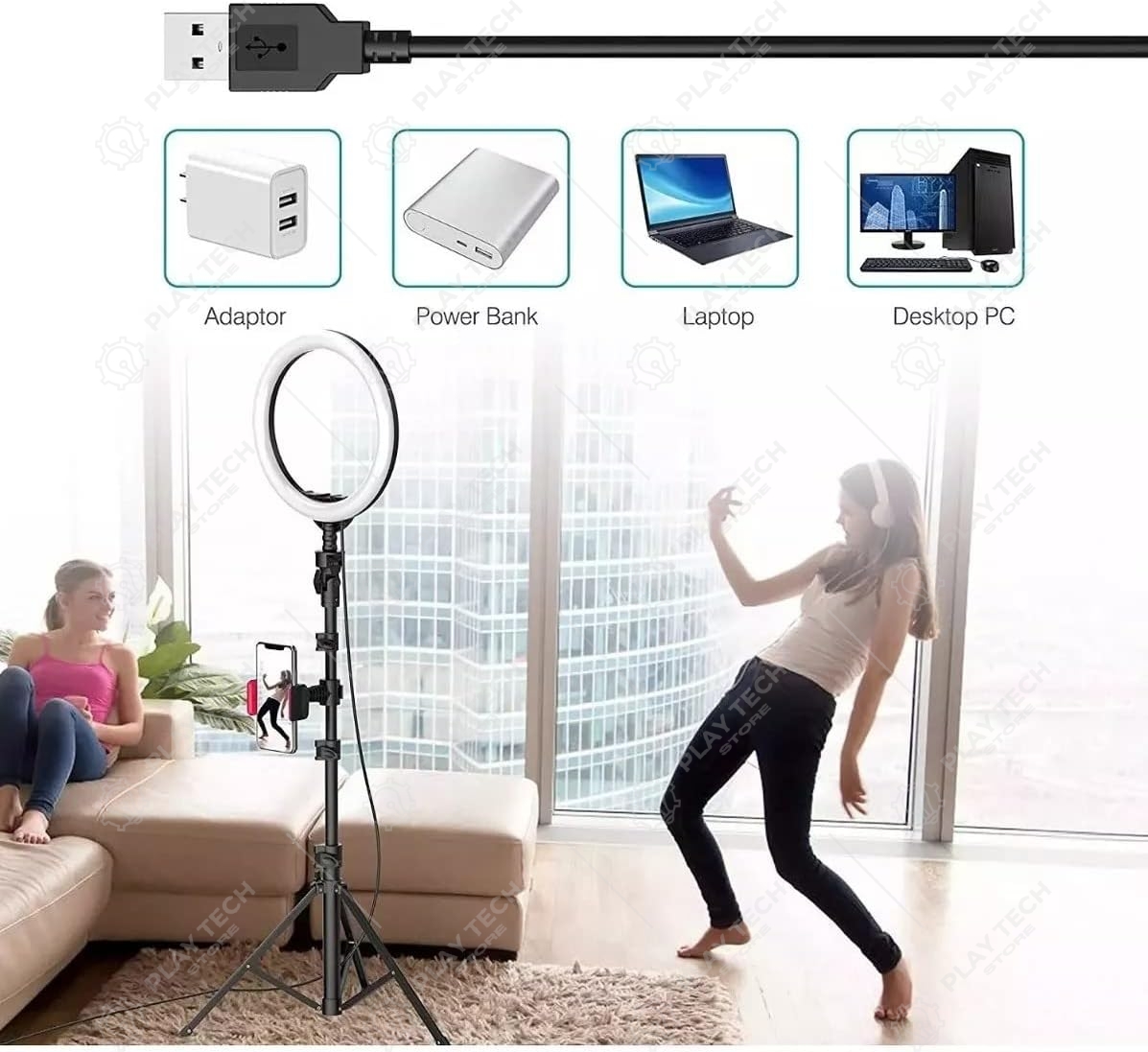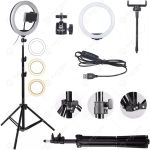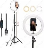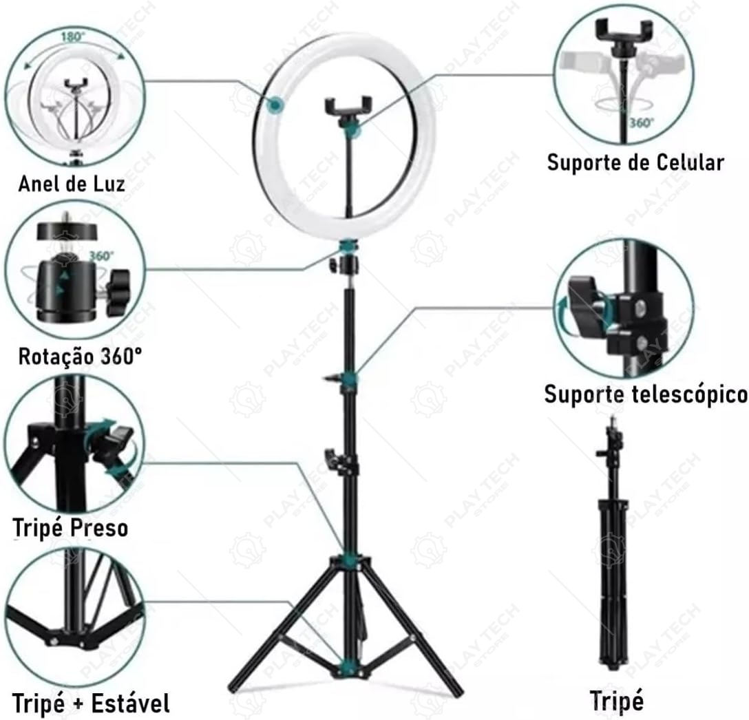 Capture fotos e vídeos com qualidade profissional com o Ring Light LED 26cm. Inclui tripé ajustável de até 2,10m, controle de brilho, adaptador de celular e cabo USB de 1,9 metros. Ideal para youtubers, fotógrafos e maquiadores.