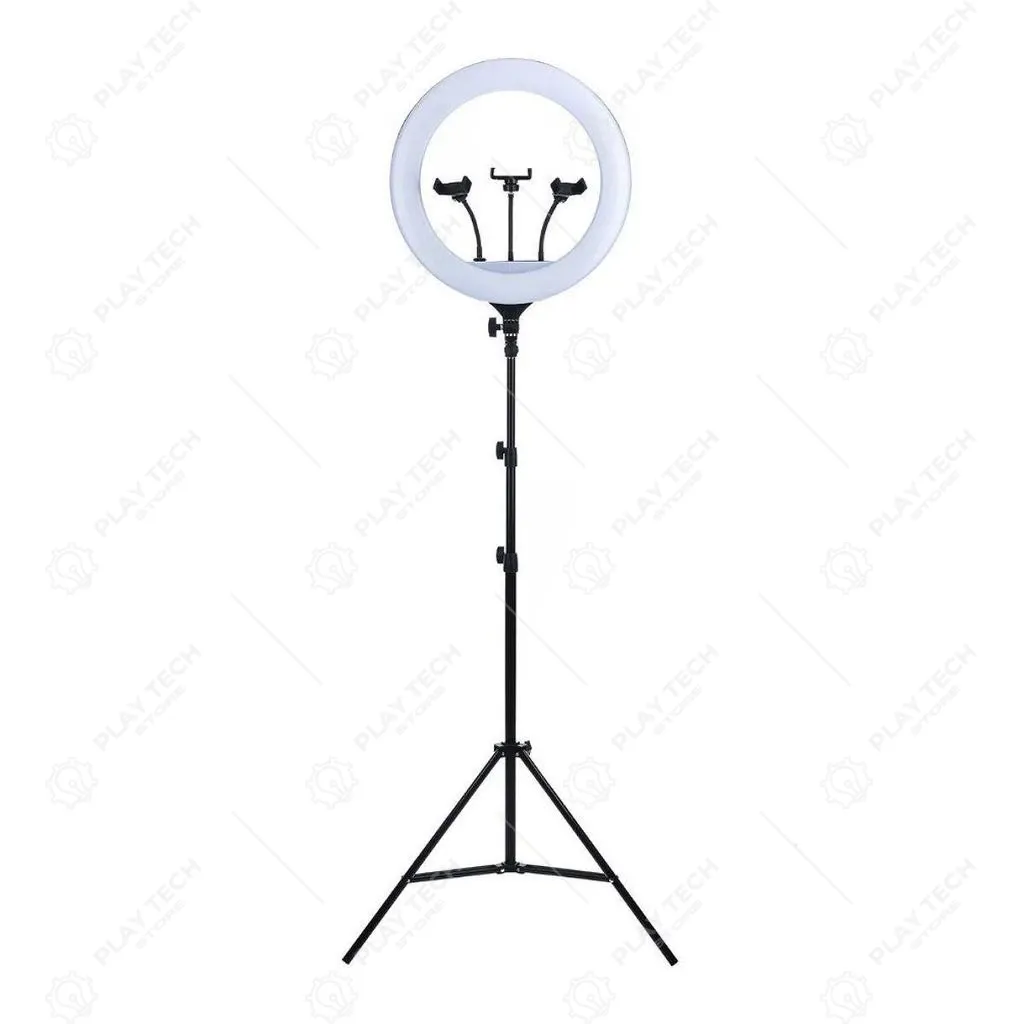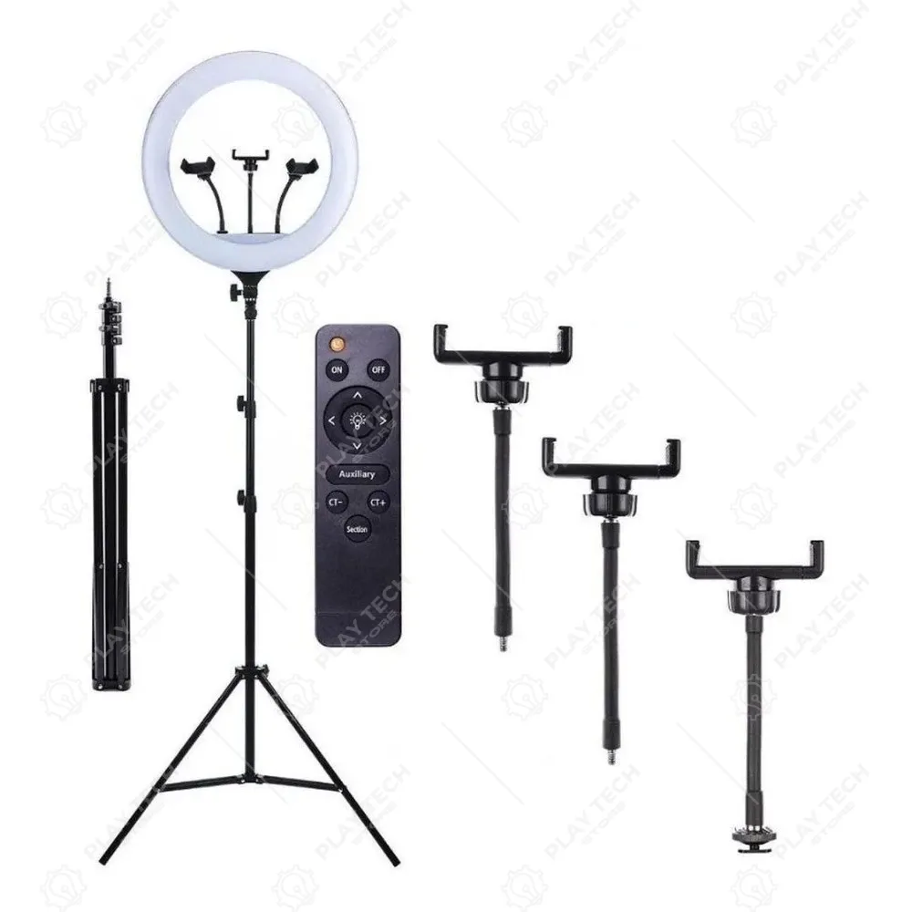 O Iluminador LED Ring Light oferece iluminação profissional ajustável entre Branco Quente e Branco Frio, com tripé extensível de alta qualidade. Perfeito para maquiagem, gravações, fotos e transmissões ao vivo. Compacto, bivolt e com suporte para celular incluso.